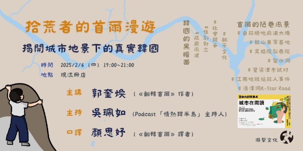 活動還特別邀請《翻轉首爾》的譯者顏思妤擔任口譯,確保現場交流無礙。這將是一場結合城市地景、社會議題與文化反思的對談,無論你是對韓國文化抱有濃厚興趣,還是希望透過鄰近國家來反思台灣的現狀與未來,都歡迎一同來參與。