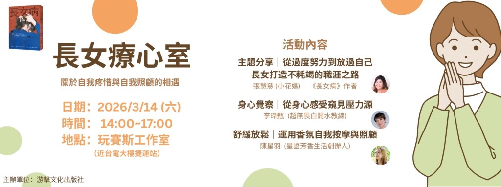 當『長女病』不只是單一個案,我們思考的是:除了從書中找到共鳴,還有什麼方式可以幫助我們療癒長女病?